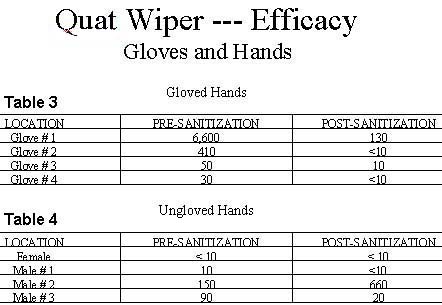 None of the samples contained Staphylococcus aureus, Salmonella or Escherichia coli CFU's. With the exception of two results, significant reduction in plate counts were observed. The quat wiper exhibited the greatest effect on surfaces with the highest microbial load prior to sanitization. The increase observed on the Break Room surface was attributed to experimental error, whereby the 2 inch by 2 inch sampling template was exposed to an unsanitized area.