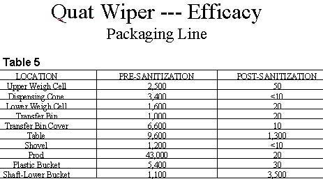 Testing of the effectiveness of the quat wiper on food contacting surfaces indicated that the concentration of the activated solution is effective in reducing microbial levels on food contacting surfaces. Table 2 summarizes the testing conducted to date on actual processing surfaces used in the production of spices and ready to eat food products. Results are reported as aerobic plate counts ( CFU --- colony forming units ) taken using sterile swabs from a 2 inch by 2 inch square area of each test surface. The sanitization process was accomplished by using the wiper to thoroughly wet the surface with the activated solution, which was allowed to remain in place for at least one minute. Following exposure, excess solution was wiped up and the surface was allowed to dry prior to swabbing with sterile swabs.