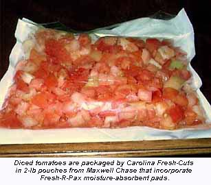Strobel continues, "So if a restaurant orders, for example, 100 pounds of diced tomatoes from us, the establishment gets 20 five-pound packages. The refrigerated, unopened packs have an easy five to six days of shelf life without a gas flush."