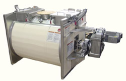 These mixers were designed to blend a tobacco product. They use an exterior melamine insulated jacket for both heating and cooling in their product processing. The larger mixer dimension is 240" in length by 44" dia. in a cylindrical trough width with a 180 cu.ft mixing capacity. The smaller mixer is approx. 1/3 the capacity. When heating and cooling, this style of trough creates the largest surface area where the agitator can mechanically move materials past the jacket surface. These mixers feature a paddle/ribbon hybrid agitator with solid steel shafting and welded arm spokes. The outer perimeter of the spokes are fitted with welded paddles. The outer paddles lift, scoop and move the product towards a center discharge while the inner ribbon is designed to move the product towards the end plates. This style of agitator works best with free flowing ingredients that tend to hump in the center of the mixer. The interior of the mixer has a #150 polished Sanitary finish in a 1/4" 316 L/W jacket. The motor on the larger mixer is a 30 Hp. gearmotor Eurodrive. The smaller mixer requires less Hp. Both include a main shaft reducer for variable speed drive. The product enters through 12" X 24" access openings, either (2) or (4) depending on size. The seals are Marion Style Split E. Each are treated with a special SS Epoxy exterior paint.