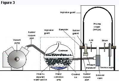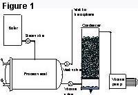 In operation the sample of the product to be decontaminated is suspended from a rack. The process vessel (approximately 0.45 m high by 0.3 m diameter is placed over the rack. The vessel is then evacuated to remove non-condensable gases. Steam is introduced and the desired temperature maintained by controlling the vacuum pressure within the vessel. After the desired treatment time has been reached the steam is shut off and vacuum cooling applied. Figure 3 shows a schematic diagram of the test apparatus.