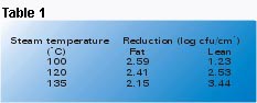 The pilot plant has been used to investigate the decontamination of peppers, soft fruit, poultry, red meat primals and consumer cuts. Studies on decontaminating beef showed no systematic difference between reductions produced on fat or lean surfaces (see table 1). On the surface of fat the reductions were not influenced by steam temperature while those on lean significantly increased with increase in steam temperature.
