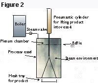 Any pressurized steam/vacuum cooling system is likely to be expensive and be difficult to automate. An atmospheric steam plant has a much simpler design (see figure 2) and mode of operation. In such a pilot plant developed at Langford, steam is continuously fed into the top of a vessel with an open bottom. As the steam fills the vessel, it displaces any air and since it is lighter than air it remains in the vessel with a slight spillage from the open bottom. The food to be decontaminated is inserted though the open bottom. After a set exposure time it is removed and immediately cooled. Initial prototypes were constructed from barrels used for transporting fruit juice. A food grade stainless steel system has now been commissioned for industrial trials.