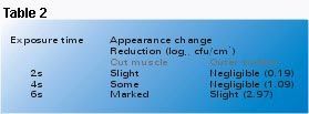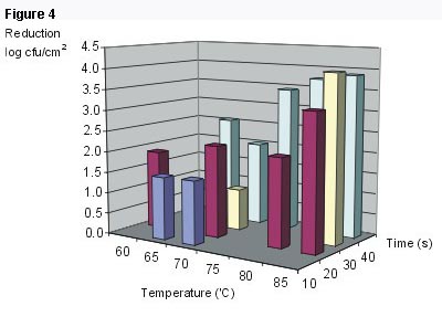 Results (see figure 4) show that there is a strong trend for the magnitude of bacterial reduction to increase with both steam temperature and exposure time. Reductions of approaching 2 log10 cfu/cm² have been measured after a 10 s exposure to steam at 65°C. After 40 s exposure at temperatures of 80 or 85°C, reductions approached 4 log10 cfu/cm². The initial indications are that using organic acid sprays in conjunction with the condensing steam can produce a small additional reduction in bacterial numbers.