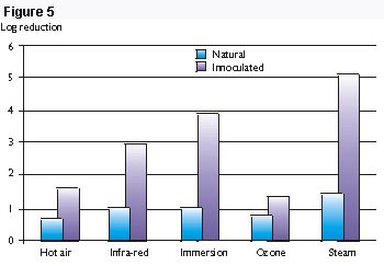 Studies on the decontamination of green peppers compared steam under pressure with other heat treatments and ozone. Steam treatments resulted in higher bacterial reductions from both inoculated and naturally contaminated surfaces (see figure 5) than any of the other treatments.